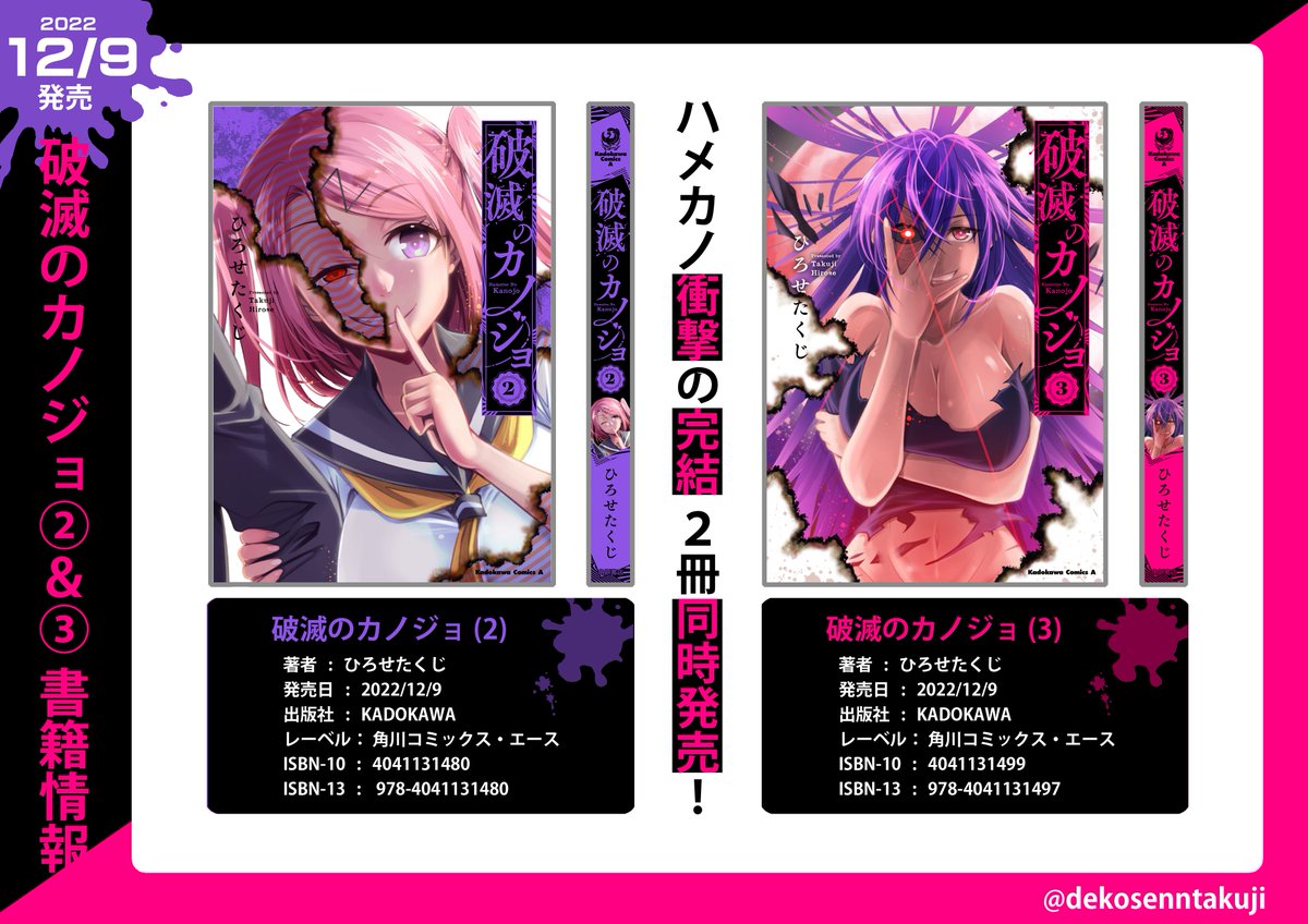 おおっ書影でましたー。 青春サイコラブストーリー 『破滅のカノジョ』2巻、最終3巻 12月9日同時発売です!! 最高にぶっ飛ばした展開になってますので、よろしくお願いします~っ☺ 2巻 amzn.asia/d/8iA1IFp 3巻 amzn.asia/d/7qavZxx