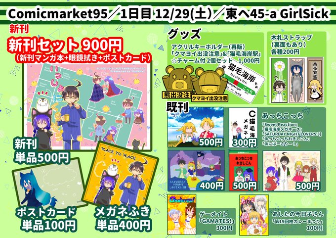 明日、12/29(土) コミックマーケット95 東5ホール東ヘ-45a(お誕生日席)にて あっちこっちFC・GirlSickで参加させていただきます よろしくお願いいたします。おしながきはこちら