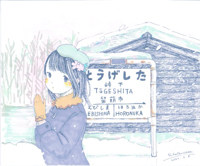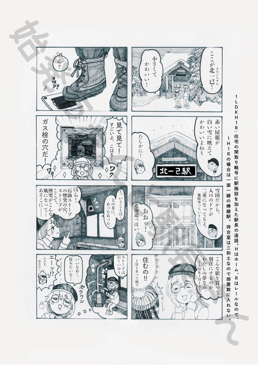【るもいせん各駅散歩 告知①】 私たちサークル「始発ちゃんと駅長さん」は留萌本線を題材にした本「るもいせん各駅散歩」を夏コミC102にて発表致します。 各駅1枚ずつイラスト・解説・4コマ漫画・ミニイラスト/写真の構成になっております。こちらは見本です。 #るもいせん各駅散歩