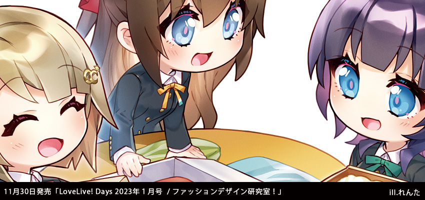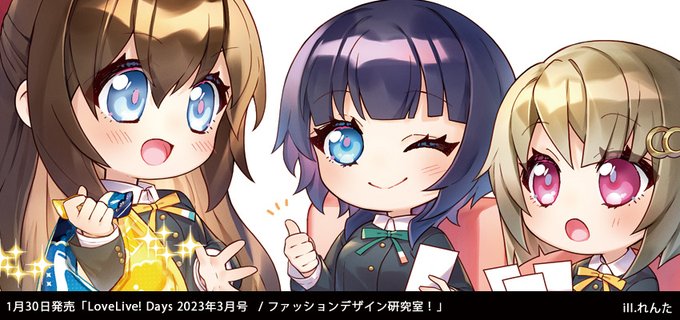 【告知】 12月28日発売のLoveLive! Days 2023年2月号の「ファッションデザイン研究室!」にてミニイラスト描かせて頂きました。 グッズのリメイクについて色々考える3人…気になる内容は本誌でご確認ください~。(1/5まで投稿募集もしてるそうなので、是非!) gs.dengeki.com/lovelive-magaz…