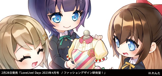 【告知】 2月28日発売のLoveLive! Days 2023年4月号の「ファッションデザイン研究室!」にてミニイラスト描かせて頂きました。 パフェコンテスト関連でお話進んでいます。衣装の全体や3人のこだわりポイントなど是非本誌でチェックしてください~! gs.dengeki.com/lovelive-magaz…