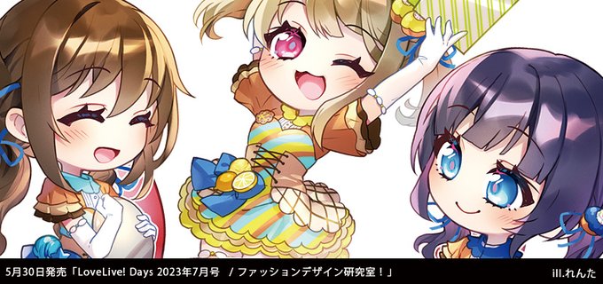 【告知】 5月30日発売のLoveLive! Days 2023年7月号の「ファッションデザイン研究室!」にてミニイラスト描かせて頂きました。 カフェ衣装の最終チェックです!この3人は勿論、全員可愛い衣装に身を包んで登場していますので是非本誌でご覧ください~! gs.dengeki.com/lovelive-magaz…