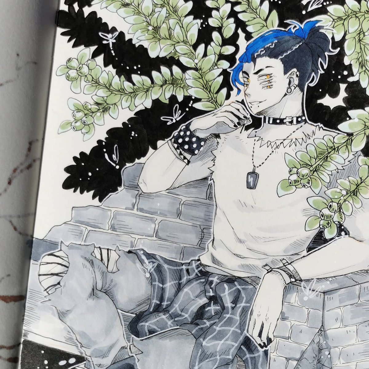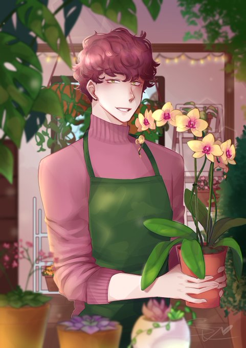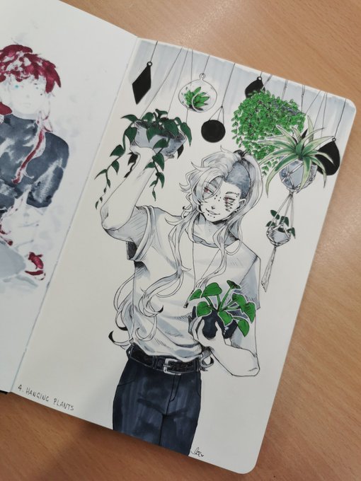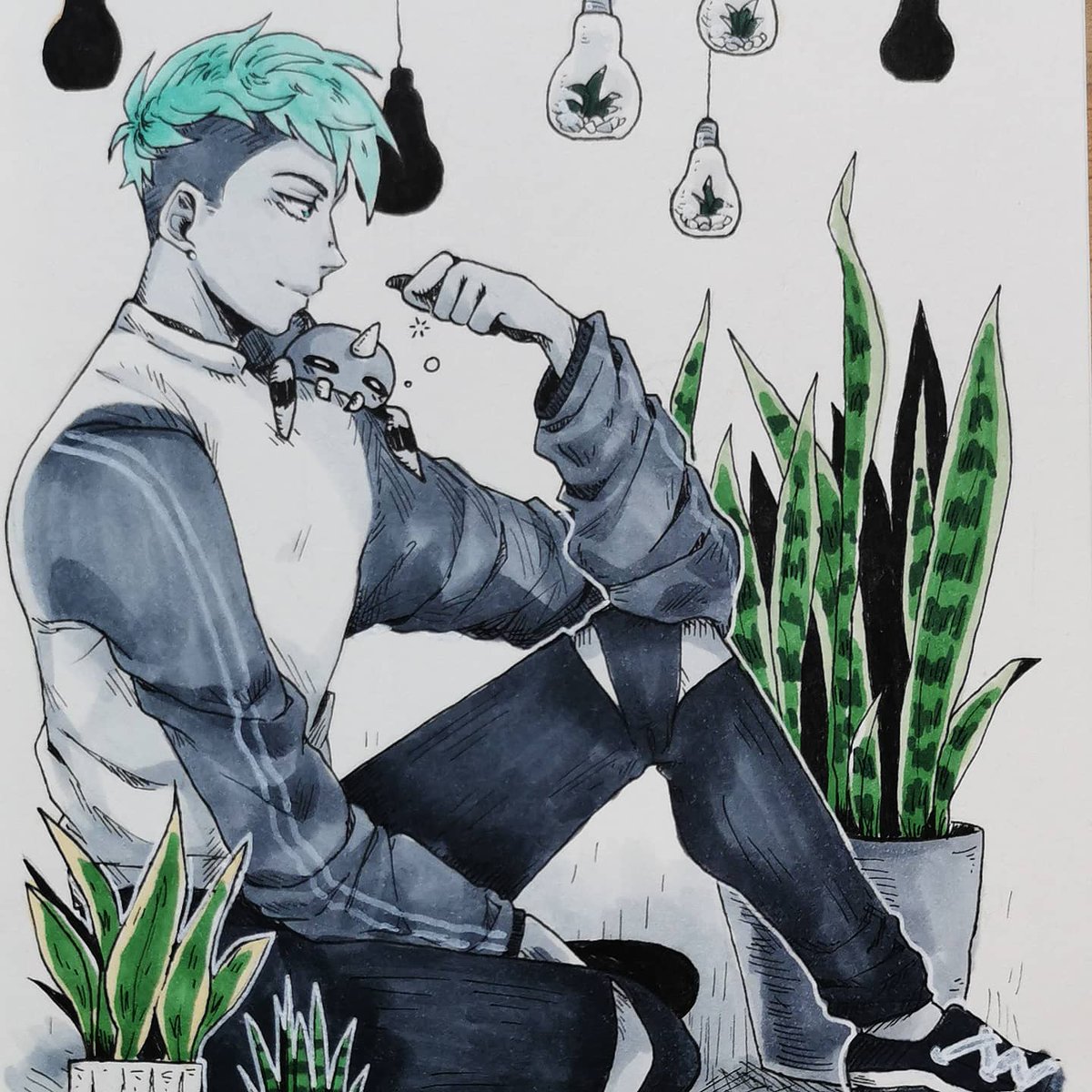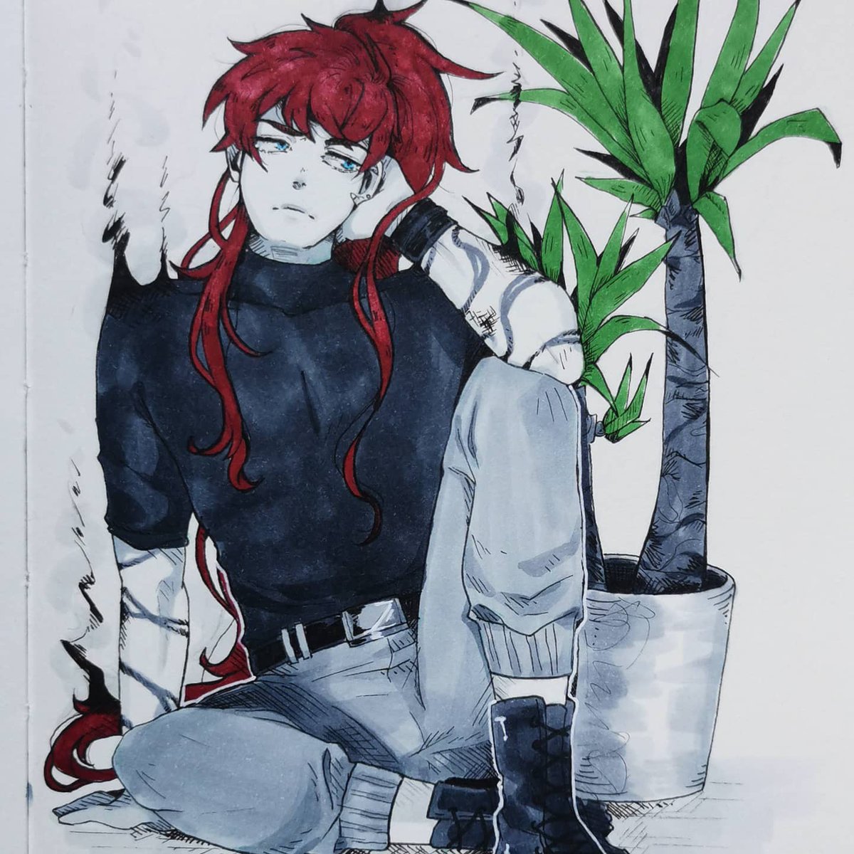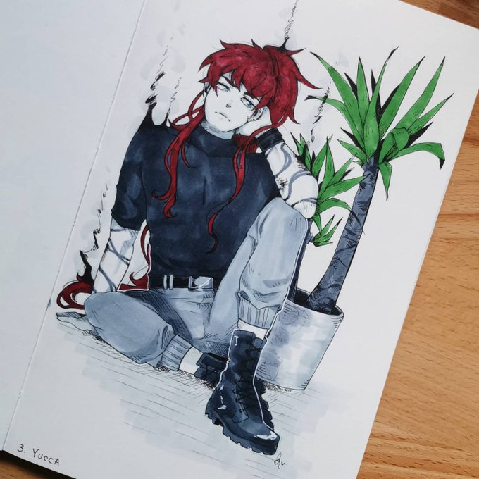 Plantober Day 3: Yucca 🌴💞 Ren chilling with his plant. #plantober #plantober2020 #drawtober #Inktober #ArtistOnTwitter
