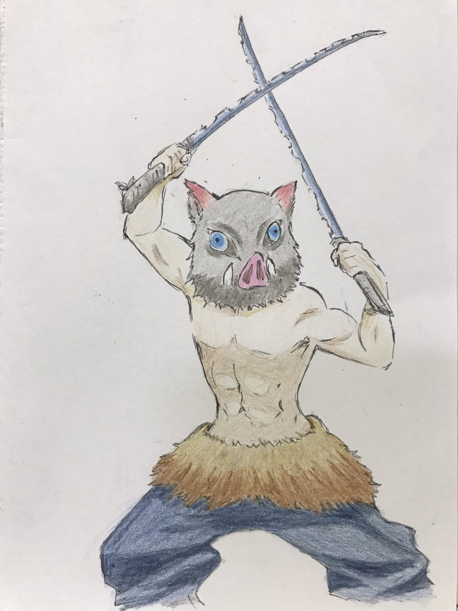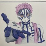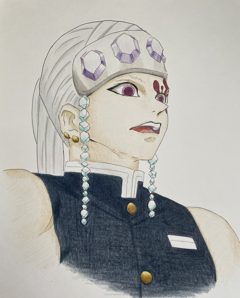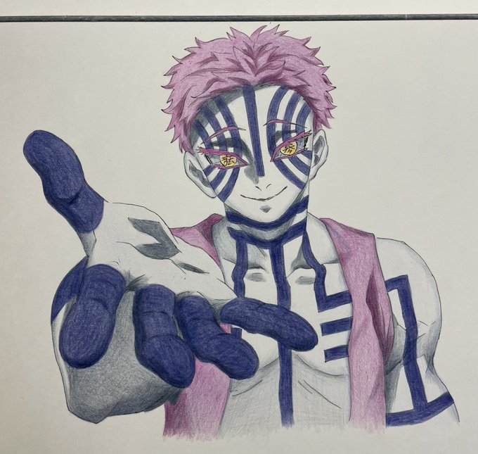 猗窩座。ちょっと小顔過ぎたかも。髪を最後に描いたらスケッチブックぎりぎり…。危なっ💦 #猗窩座イラスト #猗窩座 #鬼滅の刃イラスト #鬼滅の刃模写 #色鉛筆イラスト #模写イラスト #鬼滅の刃好きさんと繋がりたい #鬼滅の刃ファンアート
