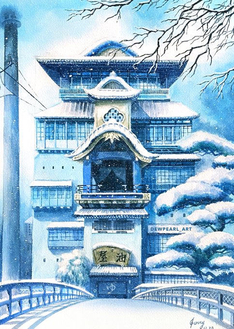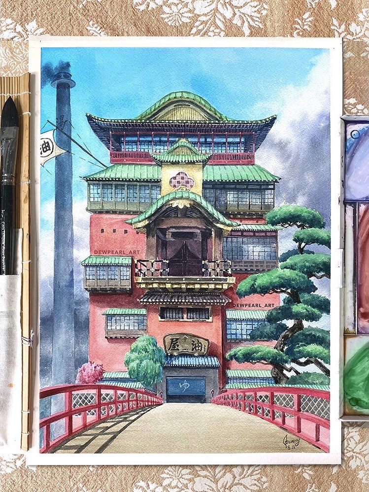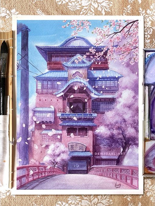 I painted the Spirited Away bathhouse – four seasons edition! 🌸🌿🍁❄️ #artistsontwitter #ghibli