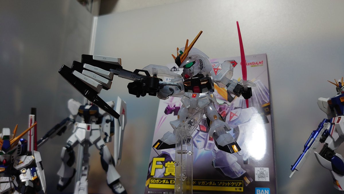 #ガンプラ #ガンプラ好きと繋がりたい #ガンプラの画像貼るとRTされると聞いて EXスタンダードνガンダム ソリッドクリア(一番くじF賞)作成完了、クリアですし墨入れと部分塗装仕上げです。 HWS作る予定が積んでた箱が見えて急遽先に崩しました。オリジナルギミックは一昔前のBB戦士を思い出しますね😅