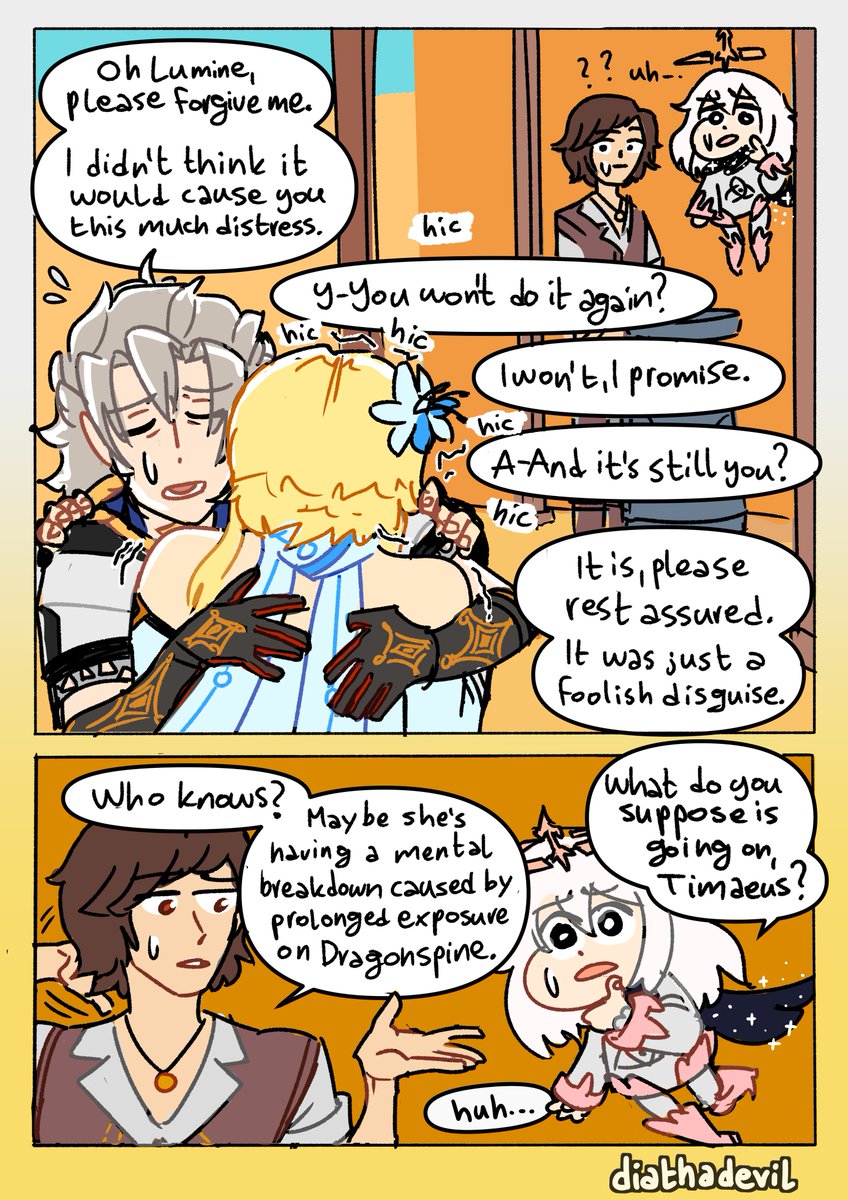 I needed to make a quick doodle comic of that Susbedo scene in Act 2, but make it so that it was painfully obvious only to the Traveler that it's not hIM. #Albedo #GenshinImapct #genshinimpactfanart #Lumine
