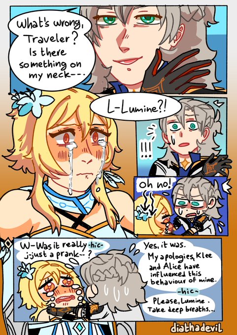 AU where Albedo does his prank but Lumine's emotionally reactive about it because she doesn't wanna lose her close companions..... ( aka why must you toy with us and our hEARTS-- ) #Albedo #albedofanart #Albelumi #Lumine #GenshinImapct #genshinimpactfanart
