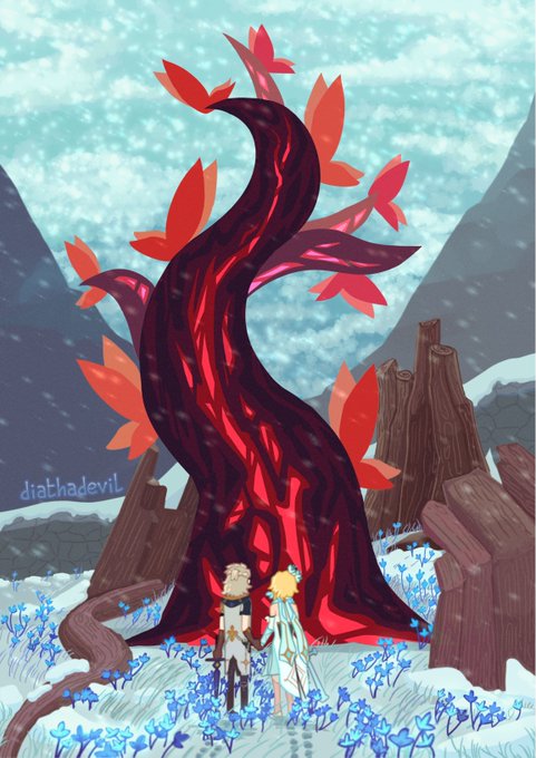 Did a painting of the Frostbearing tree, I really love its design and wanted to do fan art of it! (It’s been a slow progress the past month but I’m glad I got it done. o/) #GenshinImpact #genshinimpactfanart #Albedo #Lumine #albelumi