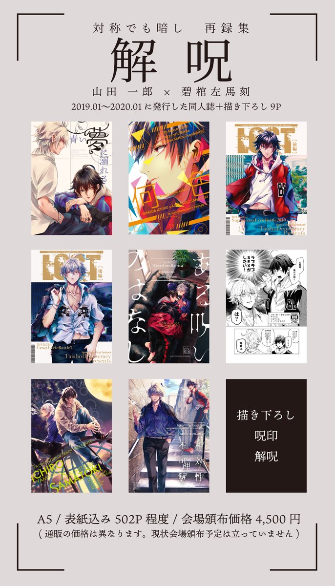 対称でも暗し 一左馬 再録集【解呪】 既刊8冊+描き下ろし9P 収録 (【青い夢に溺れる】のみ加筆修正有り) size : A5|page : 502 P(多分) |for adult サンプルまとめ|pixiv.net/user/5306926/s… 通販|ec.toranoana.jp/joshi_r/ec/ite…