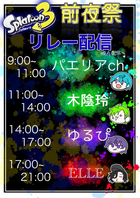 《お知らせ》だ!!! スプラトゥーン3 前夜祭をみんなで楽しみたいという気持ちから、 僕らでリレー配信をすることにしました😈︎💕︎ 明日の9時〜21時まで、パエリア→れいちゃん→ゆるぴ→ELLEの順番で配信枠を開きますので是非見に来てください! みんなでフェスを楽しみましょう!!!