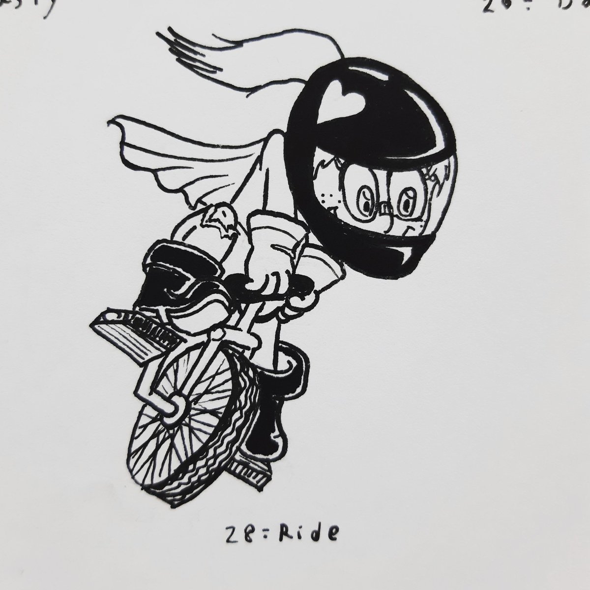 Inktober día 28: "Paseo". A pedalear sin parar! Que a tanta velocidad uno igual se cae. ____ Inktober day 28: "Ride". Non-Stop pedaling. At this speed you'll fall either way. #inktober #inktober2019 #character_design #traditional #ride #girl #safety_first #diegriv