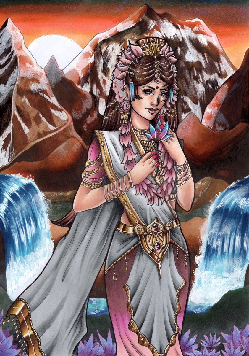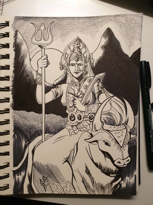 Participating into #inktober2022 but not following any list but practicing for my hindu goddess artbook Im planning :) Here is Goddess Shailaputri, the first form of Goddess Durga and considered to be the purest form of her. Her name literally means "Daughter of the Mountain" :)
