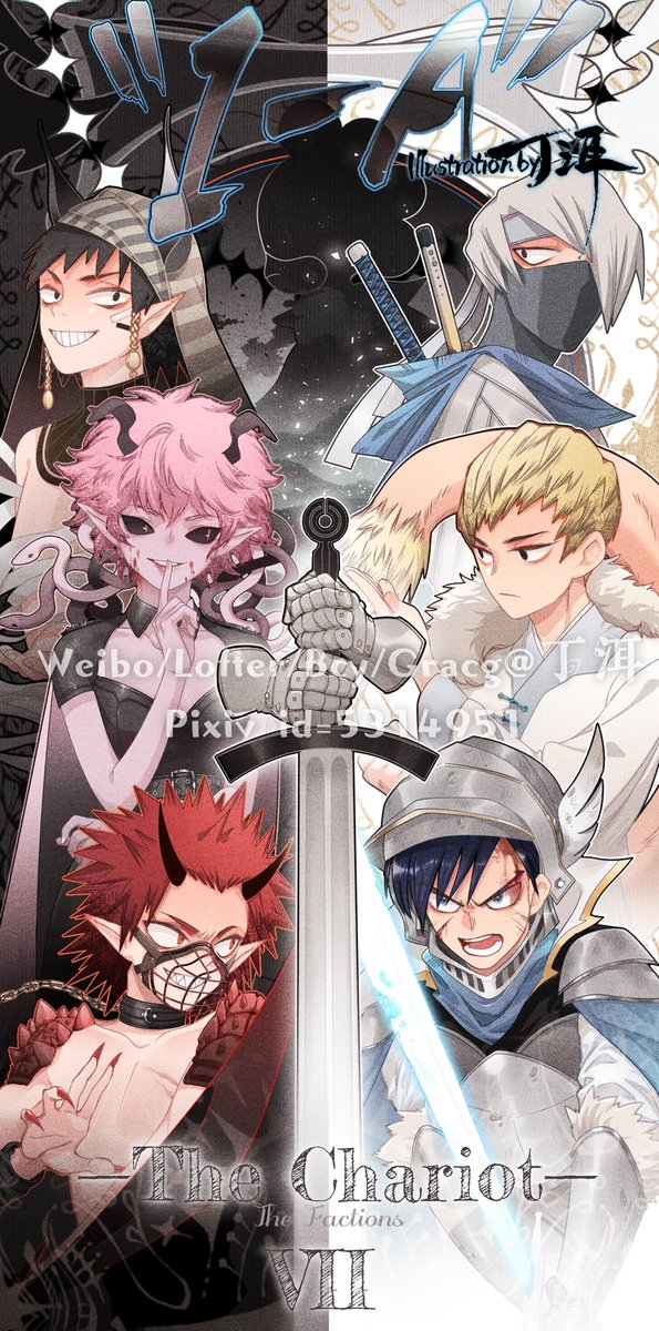 #MyHeroAcademia 小英雄塔罗牌【VII.TheChariot.战车——派阀VS路地里】 一边是死神的信徒——沉睡的僵尸王法老王濑吕,蛇发女妖芦户以及化身为红龙坐骑的鬼族战士切岛。 另一边是小天使的盟友——忍者障子、 武者尾白和骑士饭田。 还有隐形于光明的执剑者叶隐和隐藏于黑暗的神秘葡萄人。 改了一下颜色