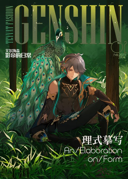 #Alhaitham 杂志封面·2月 接上期脑洞。2月号的影帝专访是卡维策划的,拍摄封面时为了找他想要的孔雀,预算严重超支。据知情人士透露,卡维从前为拍艺术片卖了房子,一直借住在好友艾尔海森家,还欠艾尔海森很多钱,这次杂志的收入也会全部用来还给债主,但找孔雀的钱不知道还不还得上。