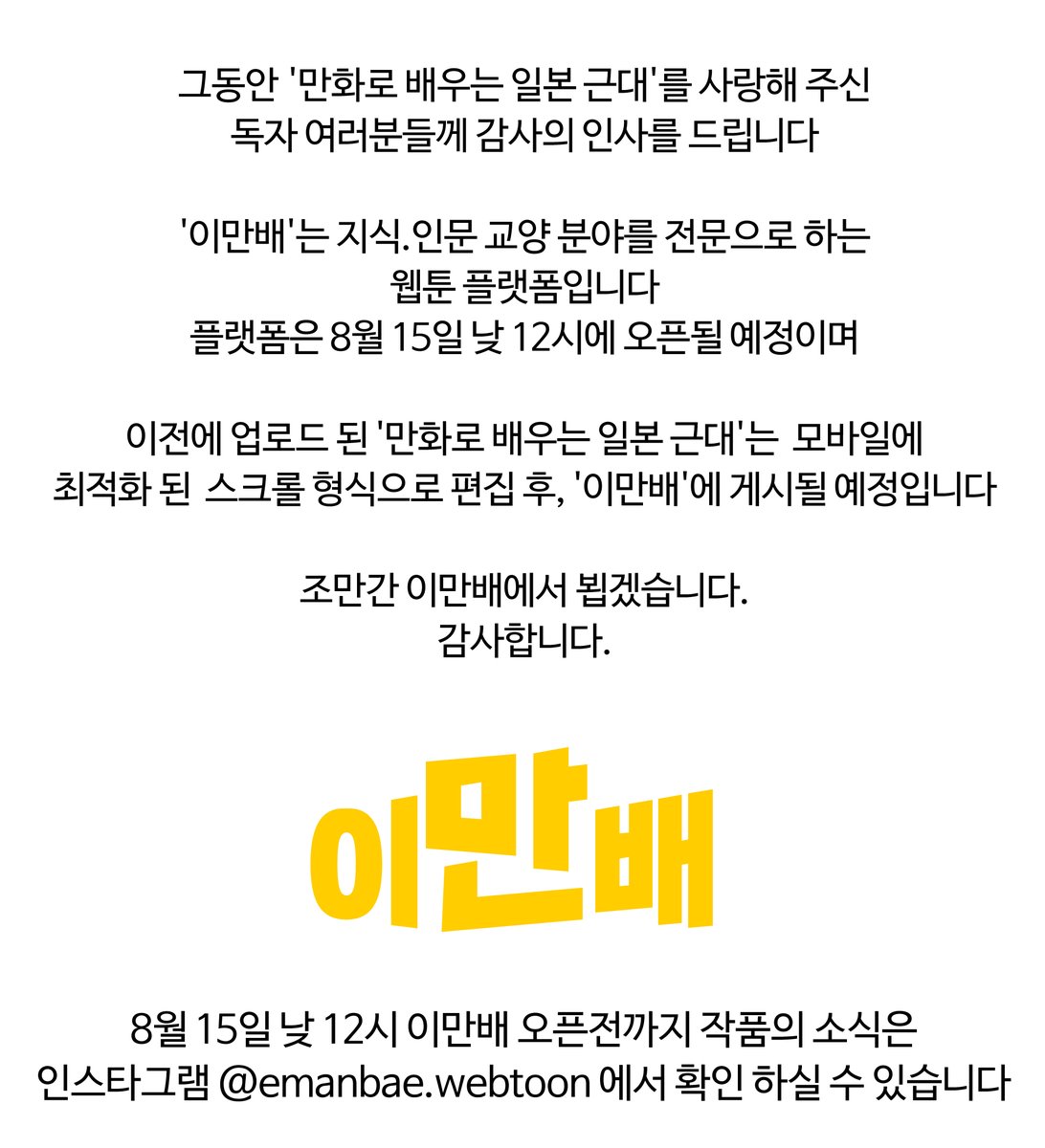 독자 여러분들의 성원덕에 '만화로 배우는 일본 근대'가 '이만배(이걸 만화로 배워?)'라는 웹툰 플랫폼에 정식연재가 결정되었습니다. 앞으로도 잘 부탁드립니다
