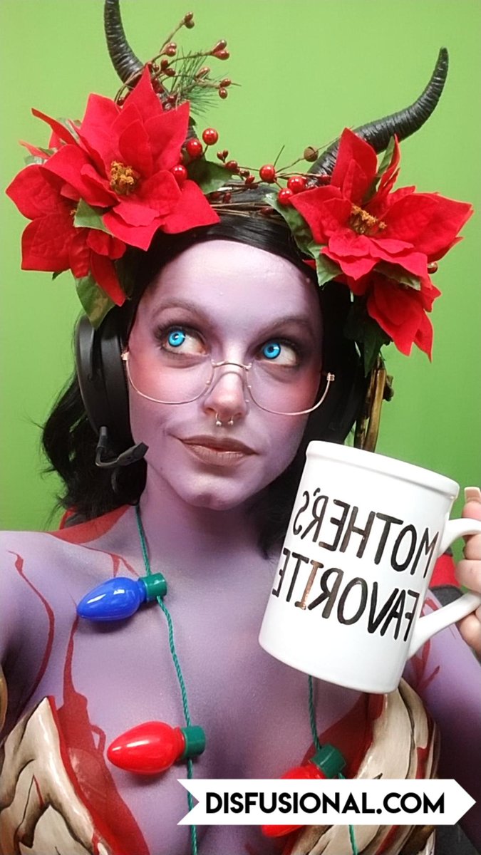 I could not help myself! With the #HolidaySeason upon us; I had to have Daughter show off her #Tennobaum cheer. Of course Kaelli would have some Krampus horns to set the whole look off! #warframe #cosplay #keepitcreepy @PlayWarframe @DigitalExtremes