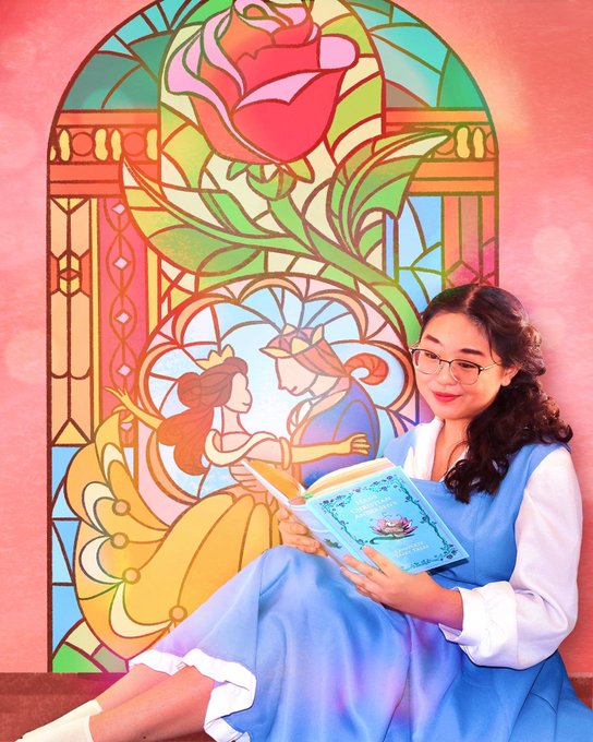𝕙𝕖𝕣𝕖’𝕤 𝕨𝕙𝕖𝕣𝕖 𝕤𝕙𝕖 𝕞𝕖𝕖𝕥𝕤 𝐏𝐫𝐢𝐧𝐜𝐞 𝐂𝐡𝐚𝐫𝐦𝐢𝐧𝐠 👑🌹📚 recreated my own artwork with cosplay! 😆🙌 Made for this month’s exclusive Patreon reward. Wanted to put myself by that beautiful stain glass window too 🥰 #Belle #BeautyAndTheBeast #cosplay