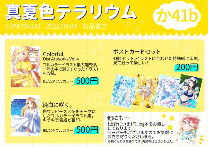 お手伝いいただいて設営を完了しました❤️🔥❤️🔥❤️🔥 【か41b】にて、イラスト集×2とポスカセットを携えてお待ちしております✊ 無配ペーパーと名刺、おまけのlog本もあるのでお気軽に〜〜〜よろしくお願いします! #コミティア141 #COMITIA141