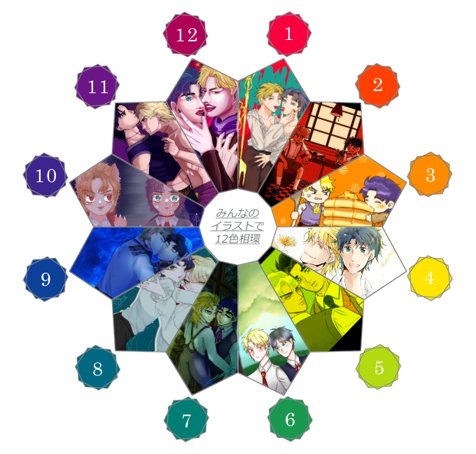 #みんなのイラストで12色相環 大変お待たせいたしました〜〜〜!!! ディオジョナで12色相環出来上がりました! 参加してくださった相互の方々、ほんとうにありがとうございました🙌💖 私は3番と5番を担当させていただきました! 参加者様は以下リプライにて記載してあります🙇♂️