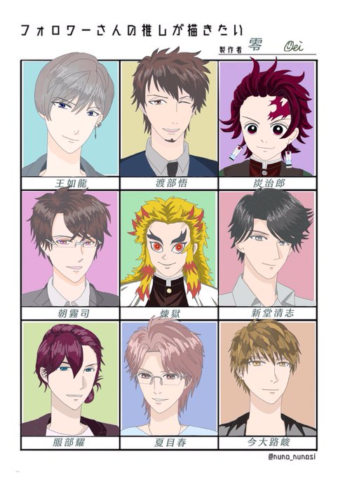 #フォロワーさんの推しが描きたい やっと完成しました⋯⋯ 頑張ったのですが、ひとり塗る毎に正解がわからなくなって行ったり来たりしました_(┐「ε:)_ 9名の方お付き合いいただきありがとうございました!(番外編はまた後日)