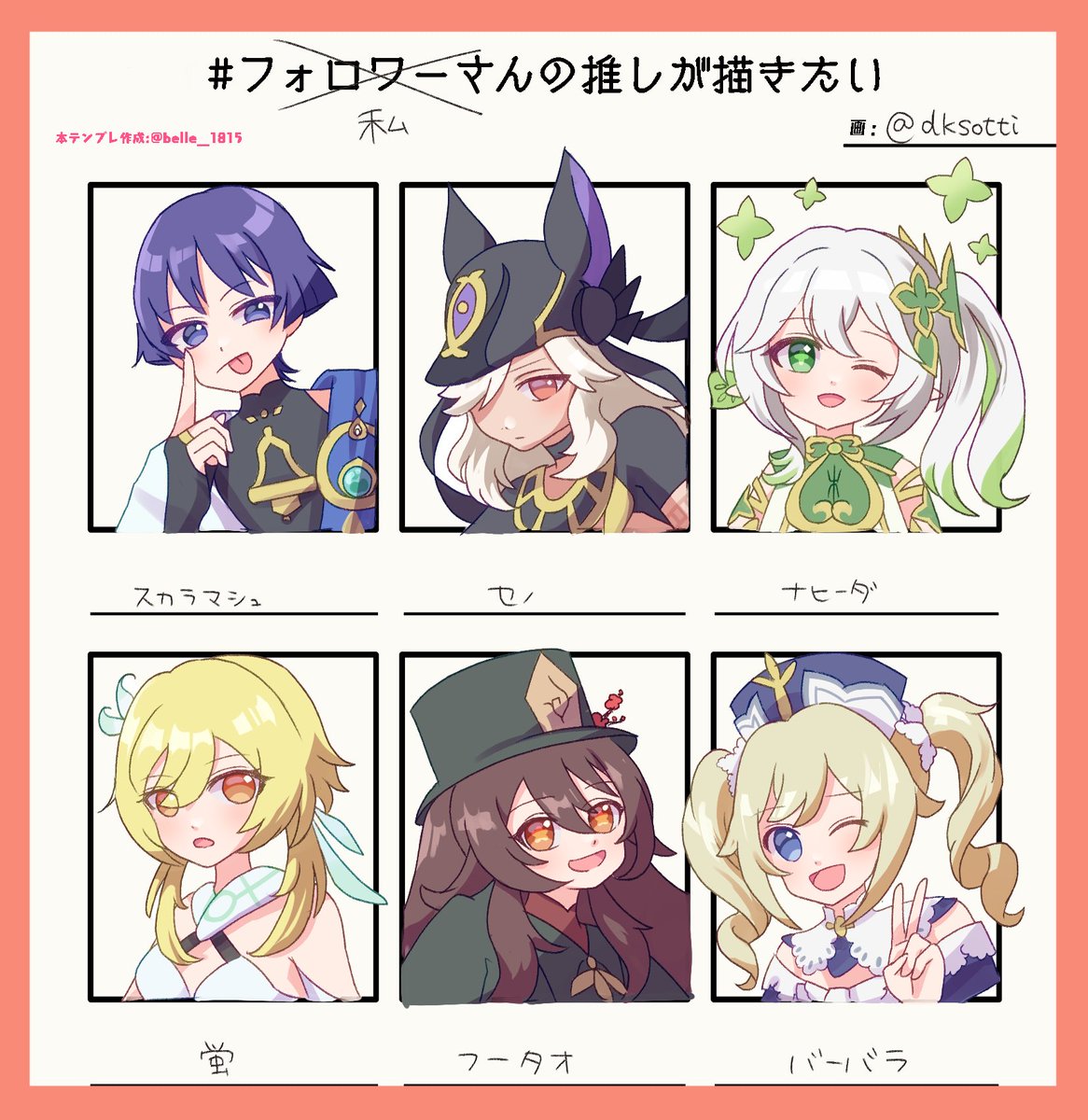 私の推し描きました🌸 放浪者(スカラマシュ)、セノ、ナヒーダ、蛍、フータオ、バーバラ #原神 #GenshinImapact