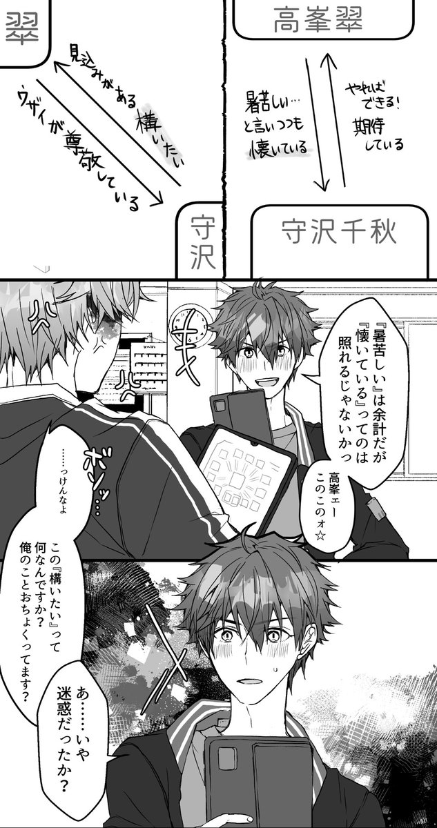 4 30 #翠千版深夜の真剣創作一本勝負 @mdca_60min お題『以心伝心』 +2H 番組撮影前に高峯を1ヶ月程構わなかった守沢、何かを悟る 23/05/12 19:56