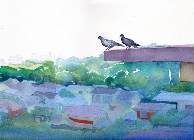 「屋上のハト」pigeons on the roof #ドボチョン日記 #水彩