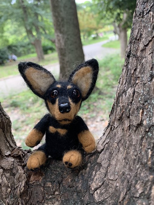 おはようございます! 曇ってるから暗いし、涼しいし まだまだ起きたくない😅 チビ斗真さんは木登りしました✌🏻 #おは戦21005og #ミニチュアピンシャー #羊毛フェルト #犬好きさんと繋がりたい