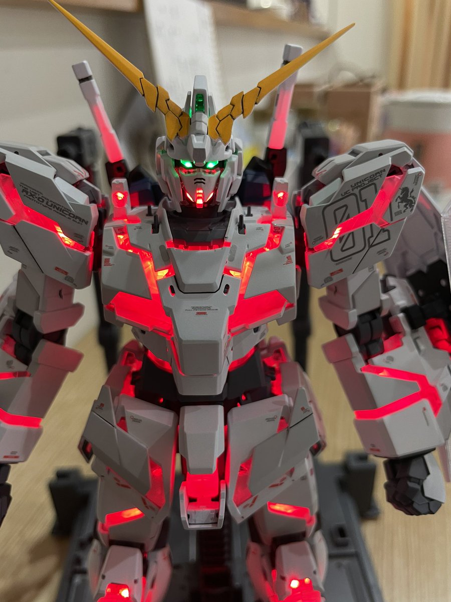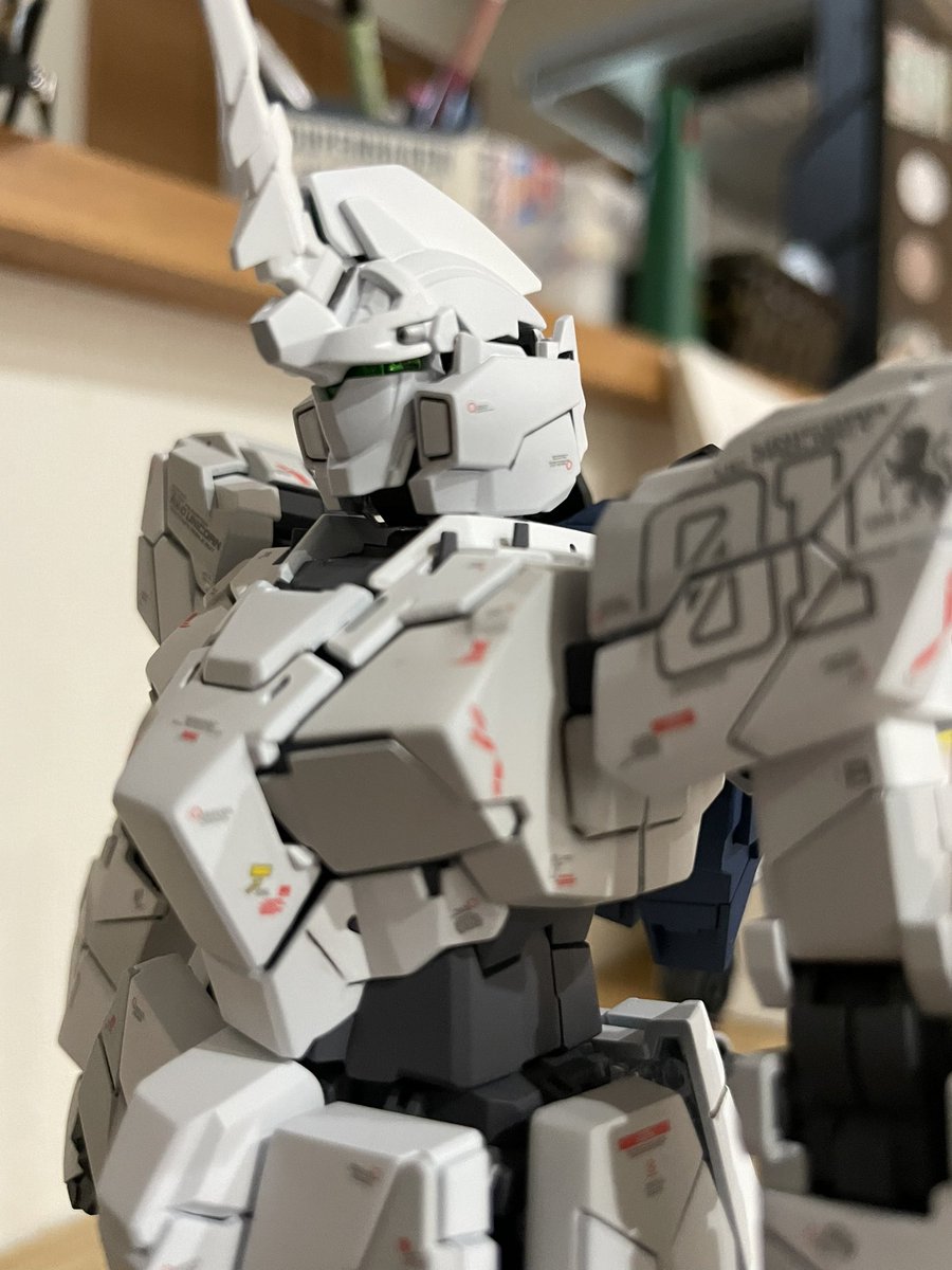 顔面の変形に苦戦して時間かかりました…デストロイモードです。2枚目はパチンコのあのシーンちょい意識してみました😅そしてユニコーンモードのフェイスは恐らく傷だらけ…泣 #ガンプラ #ガンプラの画像貼るとRTされると聞いて #MGEXユニコーン