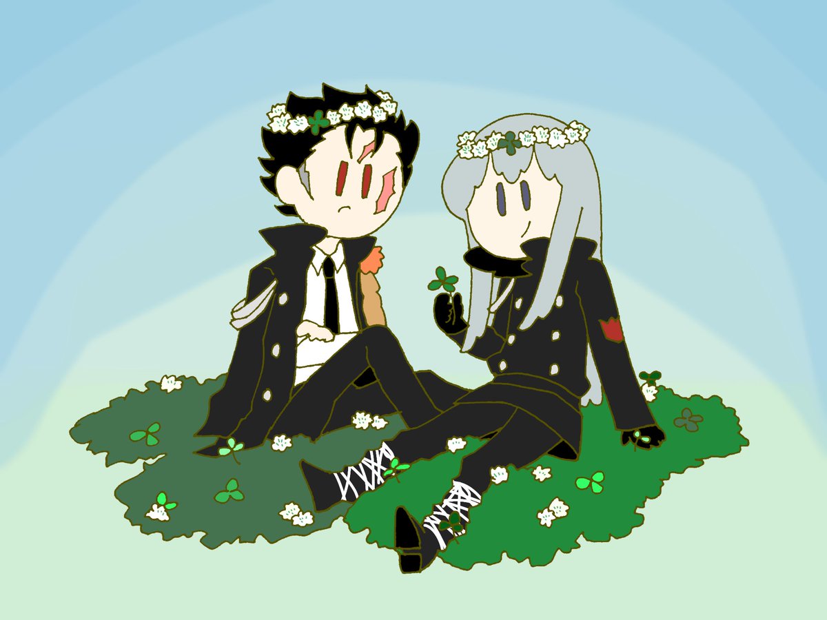 #ザンスク真剣創作60分一本勝負 お題【四つ葉のクローバー】 これは「シロツメクサのかんむりを作ってかぶらないと倒せない敵が出現したパラレルワールド」にいるボスカスです。ナイスお題ありがとうございましたー!