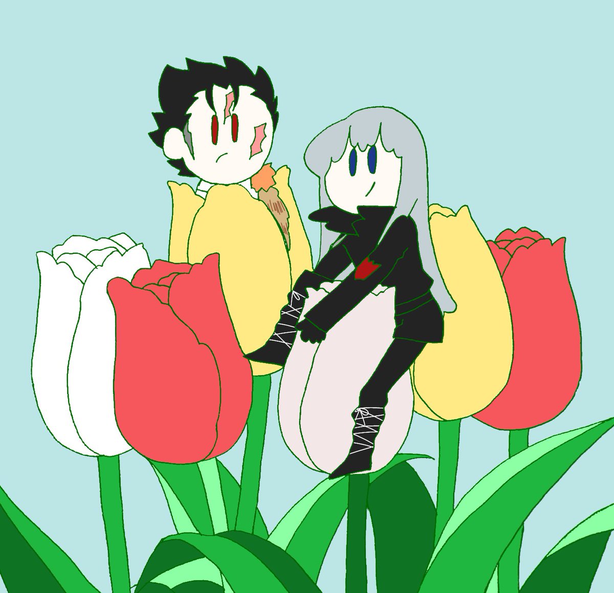 #ザンスク真剣創作60分一本勝負 お題【チューリップ】 どんな状況なのか描いた本人もわからんのですよ~~赤白黄色なのでまあええんですよ🌷どの花見ても綺麗なのでええんですよ。ナイスお題ありがとうございました!