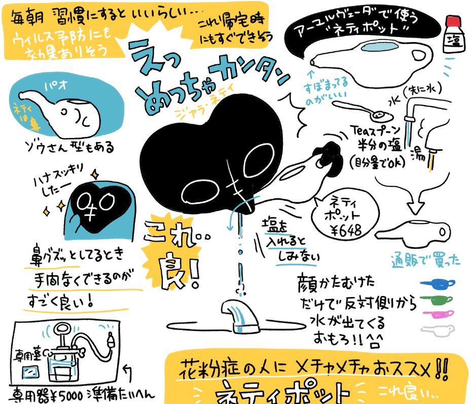 ネティポット花粉症の人にすごくおすすめしたくなり描きました。ウィルス予防にも鼻洗浄はいいらしいです… 専用機の準備や片づけが面倒なので、もっと簡単に鼻洗浄できないかと試してみたら簡単すぎて笑っちゃった