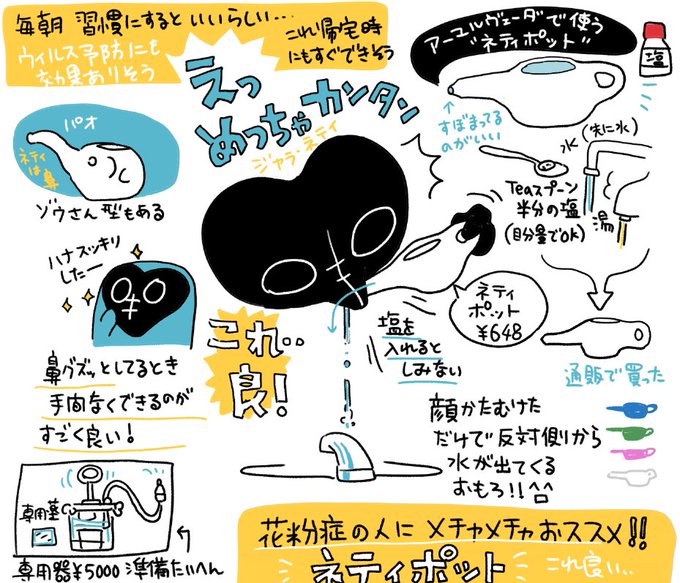 48 93 ネティポット花粉症の人にすごくおすすめしたくなり描きました。ウィルス予防にも鼻洗浄はいいらしいです… 専用機の準備や片づけが面倒なので、もっと簡単に鼻洗浄できないかと試してみたら簡単すぎて笑っちゃった 23/01/24 10:34