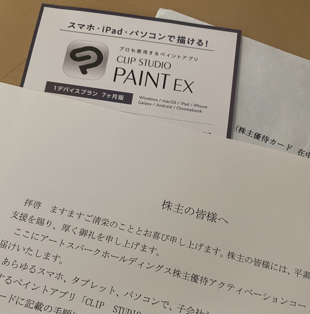 セルシスの親会社の株主になったわたくしめにクリスタEXのアクティベーションコードが株主優待で送られてきました iPad版は課金制なのでありがたいですね~みんなも株主なろう…