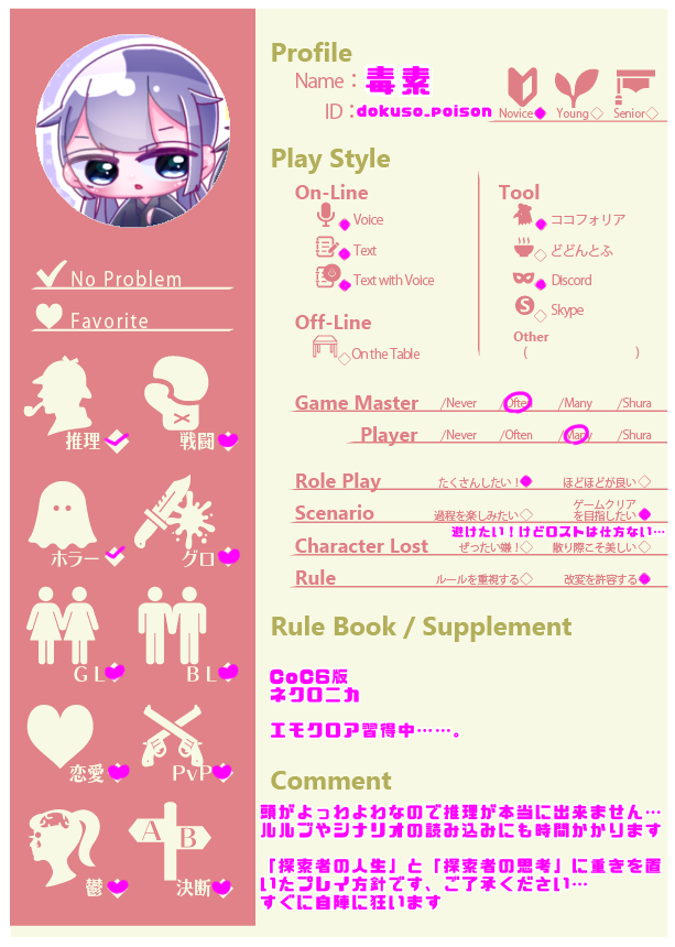 #TRPG自己紹介シート #TRPG好きと繋がりたい あそぶ人増やしたいな〜…と思ったので…かわいい女と幼馴染関係と自陣が大好きです! ❤️or🔃で無言ですがお迎えします🙌🙌