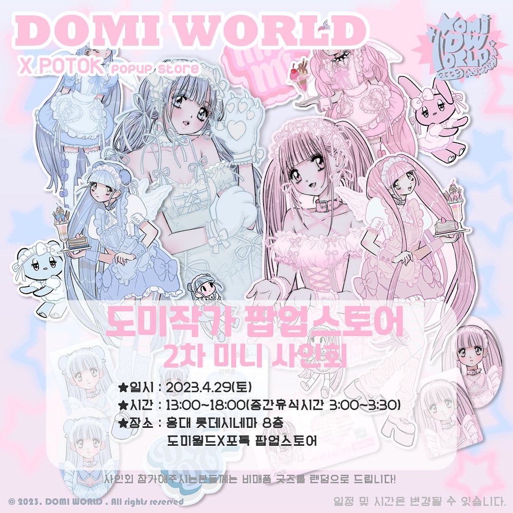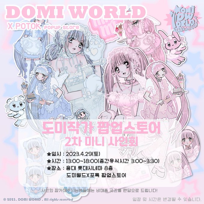 도미월드X포톡 𝐃𝐎𝐌𝐈 𝐖𝐎𝐑𝐋𝐃 𝐗 𝐏𝐎𝐓𝐎𝐊 𝘗𝘖𝘗𝘜𝘗 𝘚𝘛𝘖𝘙𝘌 도미작가 2차 사인회공지 🔗일시 : 2023.4.29(토) 🔗시간 : 13:00~18:00(중간휴식시간 15:00~15:30) 🔗장소 : 홍대 롯데시네마 8층 도미월드X포톡 팝업스토어 2차 사인회 공지입니다! 2차부터는 1인당 3장까지로 제한을… twitter.com/i/web/status/1…