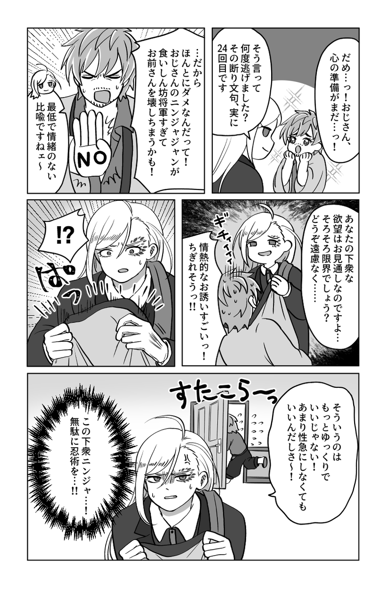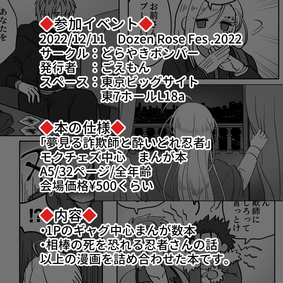 【12/11モクチェズ新刊】 Dozen Rose Fes .2022にて頒布予定のモクチェズ本サンプルです。 ・1Pギャグ中心まんが数本 ・相棒の死を恐れる忍者さんの話 以上の漫画を詰め合わせた本です。 ⚠️暴力・流血・死などの表現が含まれますのでご注意ください。 サンプルはPixivにて➡️pixiv.net/artworks/10325…