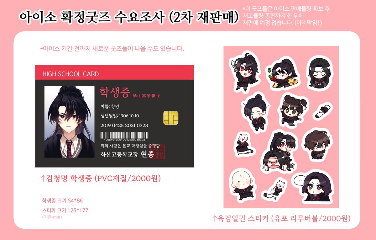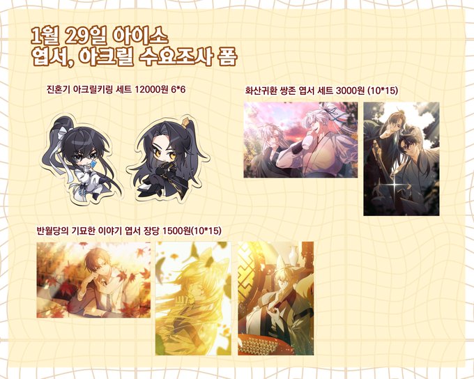 [RT] 1월 29일 아이소 화산귀환, 진혼기, 반월당 비공식 굿즈 수요조사폼입니다. (12.12(22:00까지) 만돌(@ o3o_mimimi) 님과 함께하게 되었습니다! 수량조사한 만큼만 제작 예정이기 때문에 구매하실 분들만 참여해주세요! witchform.com/demand_form/59…