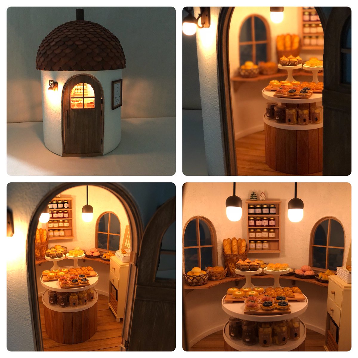 先日のミニチュアアート展2017で展示した「どんぐりのパン屋さん」🥖 灯りが点いていない画像と灯りが点いている画像です💡 こちらは12分の1サイズのハウスになります🏠 #ミニチュアアート展2017