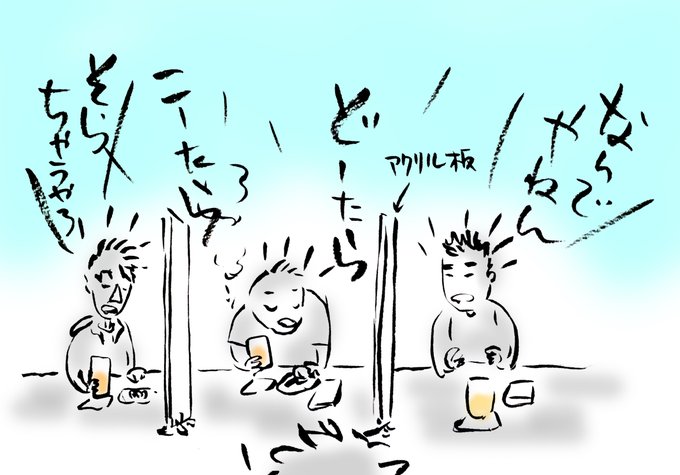 いつもの店。色気のない話で恐縮だがきょうはカウンターに3人の常連(おっさん)が揃い、マスターを交じえて時事放談を展開。お題(話題)は、奈良県警、新興宗教、自民党圧勝、ヤクルトクラスター、コロナ再燃などなど。それはもう喧々諤々で、一見さんがいたら早々に退散しただろう・・・ #イラスト