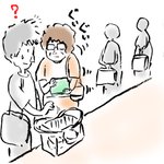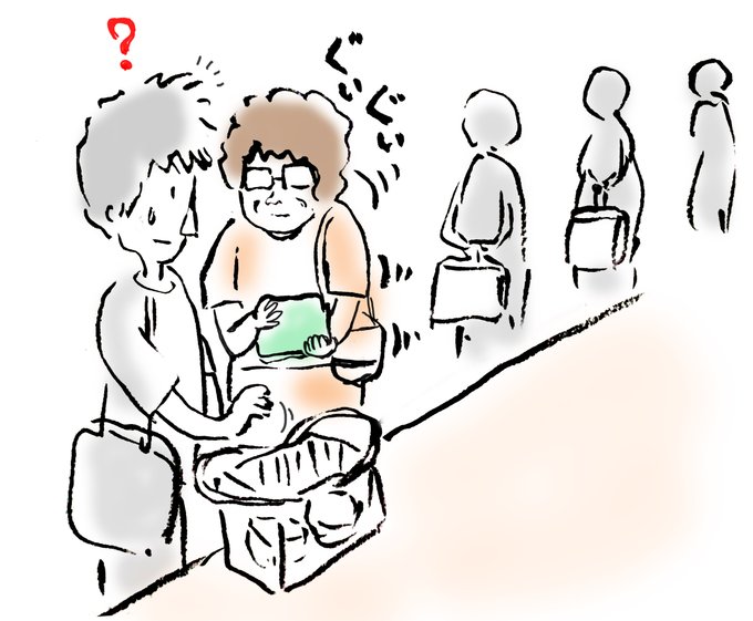 2 42 「レジ待ち」で思い出したけど、きのうドラッグストアで精算の番になって横みたら、おば(あ)ちゃんが「もう、あんた、はよどいて」と言わんばかりにぐいぐい寄ってくるのよ。ソーシャルなんとか、もあったもんじゃないわ。なんなん?あれ。※マスク省略 #レジ待ち #イラスト #エッセイ 22/08/06 15:52