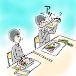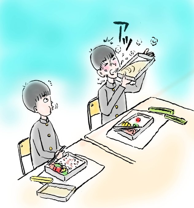 1 29 中一の昼はお弁当持参だった。この当時、皆、おしなべて「アルミニウム」のお弁当箱だった。男子の多くは、給食室からの熱々のお茶を弁当箱のフタに入れて飲む習慣があり、よく熱すぎて吹いていた。んなもん、手で持っても熱いのにクチつけたら熱いに決まっとるがな。 #イラスト #エッセイ #illusRT 22/09/27 21:41