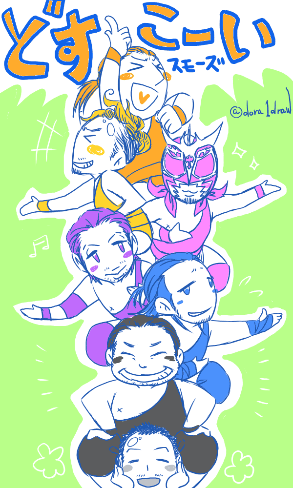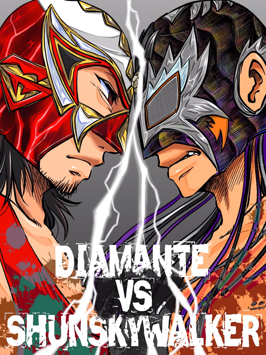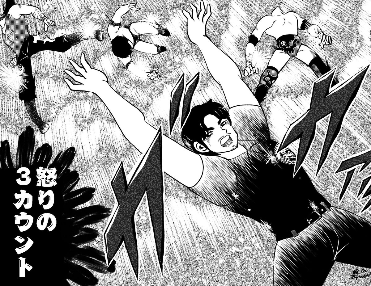 サンボー大会でkzy選手がKING清水選手の後ろのコーナーポストに登って対戦相手を待ち構えていたんですがなんか絵になるなぁって描いてみた。KINGの後ろでじっくり構える姿がいいなと。 #dragongate