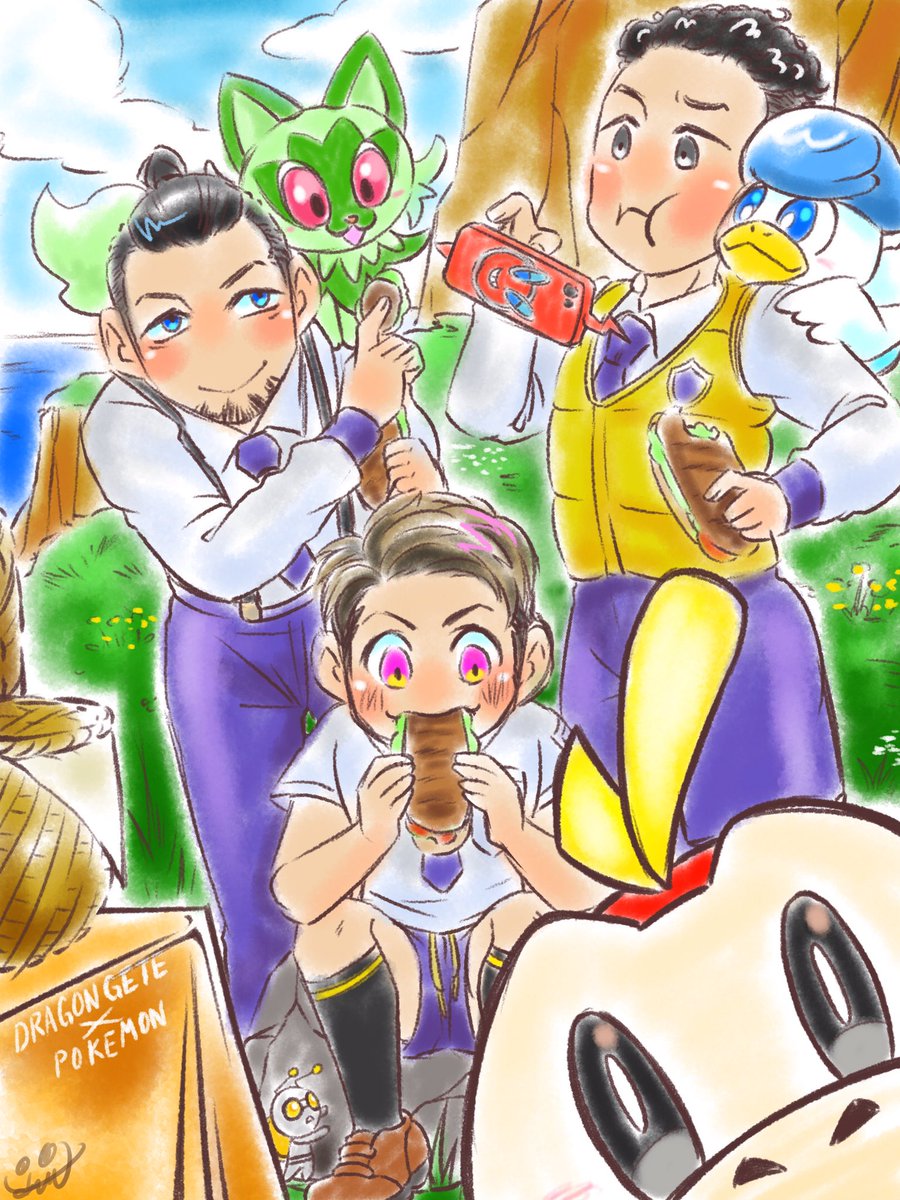 最近パルデア地方にずっと行ってる。吉岡くんと菊田くんはプレイしててダイヤくんは迷ってたのをどっかで見かけたのでDカレで描いてみました。ポケモンは全部で5匹、見つかるかな? #DRAGONGATE #D_Courage
