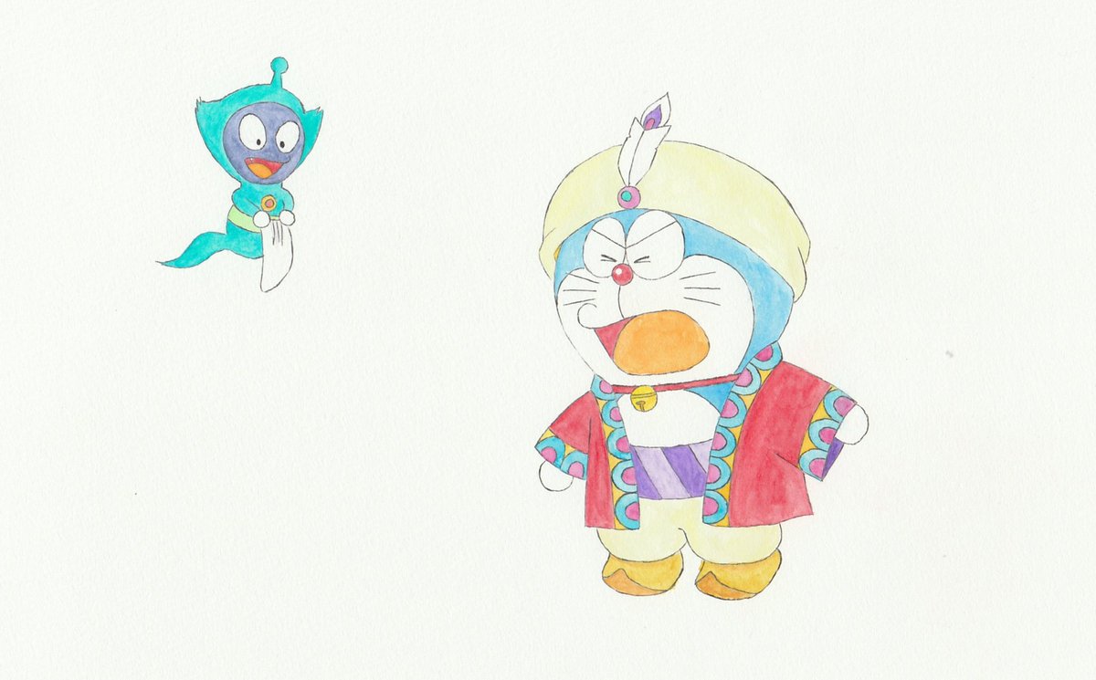 13 70 ドラビアンナイト衣装のドラえもんとドラメッドⅢ世を描いてみました。 ドラえもん「どう?似合う?」 ドラメッド「似合ってるであーる♪」 水彩で塗ってみたのは初めてかも🤔 21/09/18 16:44