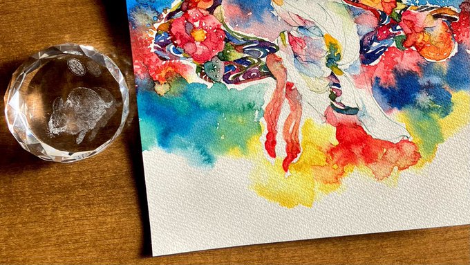 おおよそB5サイズ。アナログ絵は葉書大の水彩紙に描くことが多く水彩久々な上に自分的には大きい紙で最初一寸緊張しましたが……息切れせず描けてよかった。 随分前に貰った兎柄のペーパーウェイト。活用させて頂きました。 #透明水彩 #watercolor