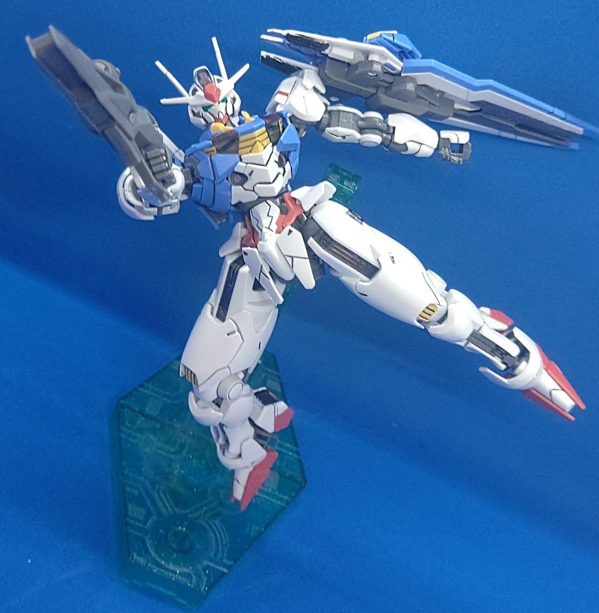 #ガンプラ #ガンプラの画像貼るとRTされると聞いて #水星の魔女 HG エアリアルのアクションです( ˙꒳˙ )胸部は選択式でインモールドパーツにすることができ、腰に穴があり、アクションベースに接続でき、ガンビットは機体の各部に付けられます( ˙꒳˙ )可動範囲も広く、ガンプラの進化を感じます。