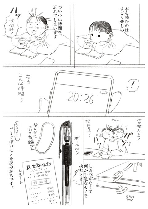 一年くらい前に書いた、絵だけの漫画が出てきたので 1年たったけど、ちょうど今読書してるし、文字を入れました。 最近は友人がくれた栞を挟んでいます🔖 ゴミを挟まなくて良くなったので、友人に感謝しています。 #漫画が読めるハッシュタグ