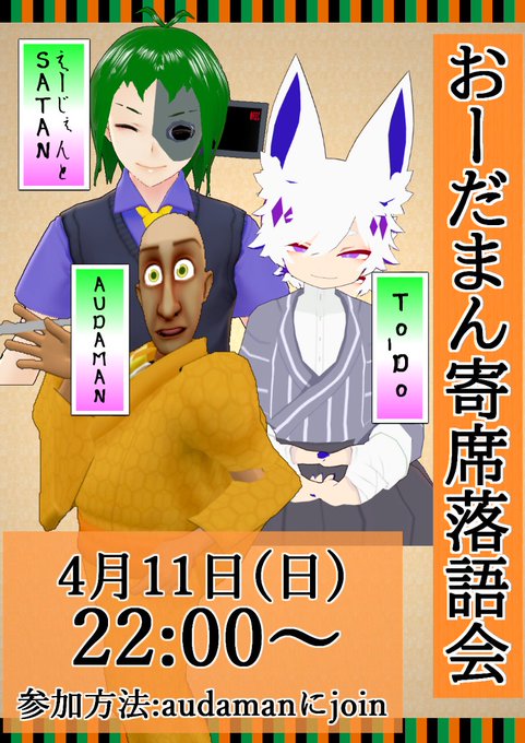 #おーだまん寄席落語会 #VRChatイベント VRC上でオーダマン主催の落語会をやります!!!! 4月11日の22:00~ VRCID:AUDAMANにjoinしてください!!! よろしくおねがいいたします!マジで!!!!!